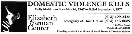 For many years we were preoccupied with learning to live with the loss of Holly. Now we are all actively working to educate our communities about the cycle of domestic violence that took Holly from us. In 1998, Mary Maddux discovered that the Elizabeth Freeman Center in nearby Berkshire County, Massachusetts, offered a variety of services for victims of family violence. She approached them with an offer of help as a way to work through her own grief and a means of creating a living memorial to Holly. From this association was born The Holly Maddux Initiative which included a bumper sticker campaign, a public service announcement with music written and performed by Mary, and the sale of a Limited Edition print of a piece of Holly's artwork as a fundraiser for the center. Please contact the EFC at
