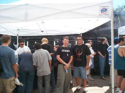 On my initial approach, it looked interesting. I couldn't see the bus that well due to the way they set up the crappy looking shade tents and the line to get in the bus right along side of it. Can you see the bus? Upon closer inspection, I must admit that the bus was genuinely bad-ass outside and in. It had an awesome paint-job and the inside was tripped out like a micro-version of Star Trek: The Experience in Las Vegas. The blacked out bus contained a small briefing area with a glowing 4'x4' Q3 emblem and an eight station gaming LAN in back with some pretty smooth running gaming stations. I won't get into the gaming setups. I heard complaints about having to stand, no room to mouse, etc... but as usual I didn't hear much from the winners.
