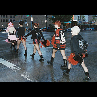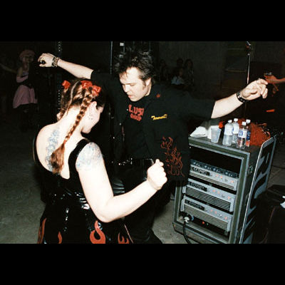 We crossed the street to the Frog Design party. Frog Design had the good taste to book the Flametrick Subs together with the Satan's Cheerleaders. What a fucking show! I'd forgotten how good it was to see them together. I had a fantastic time as can probably be seen from this image of me gettin' down with Lucky Dukes. (I wonder if Lucky was feelin' texy, 'cuz Tex was definitly feelin' Lucky!)
