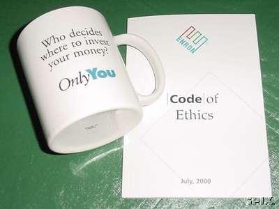 of coffee cup states "Enron Retirement Planning" and the back states "Who