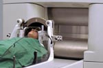 When treatment planning is completed, you will be moved into the Gamma Knife treatment room where you will be placed on the "couch" or Gamma Knife table. A large silver helmet will be attached to the table, and you head frame will be attached to this. Once all of the coordinates are set for your treatment, a microphone will be attached to your hospital gown, and the Gamma Knife team will leave the room. Monitors are set up for the physicians and physicist to watch you during the procedure, and the microphone will allow you to communicate with them. When the procedure begins, part of the Gamma Knife table will slide back into the dome, and the actual radiation treatment will begin. Your treatment may last anywhere from 30 minutes to 2 hours depending on you diagnosis.