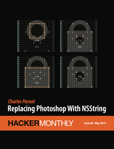 Issue #60 features "Replacing Photoshop With NSString" by Charles Parnot on the cover and "Why (and How) I Wrote My Academic Book in Plain Text" by Caleb McDaniel. And, we have "I Made an NES Emulator," "Index Your Gmail Inbox with Elasticsearch," "A Practical Introduction to Functional Programming," and article about John Carmack's first game "Shadowforge" by Chet Bolingbroke.
