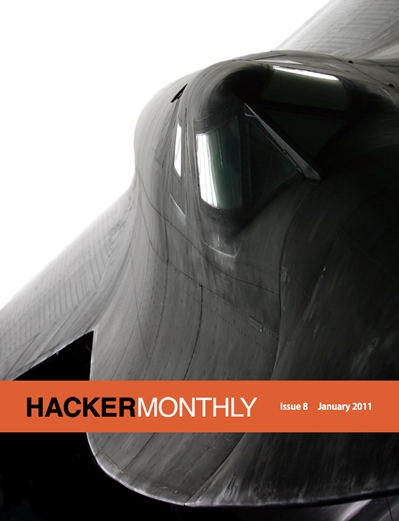 SR-71 Blackbird (cover) is making a comeback since the launch issue. Don't miss "Hacker's Guide to Tea" (especially if you enjoyed "The Coder's Guide to Coffee"). AWK, Python and the Immortal Hamburger also make their way into this New Year's issue. Happy 2011, everyone!