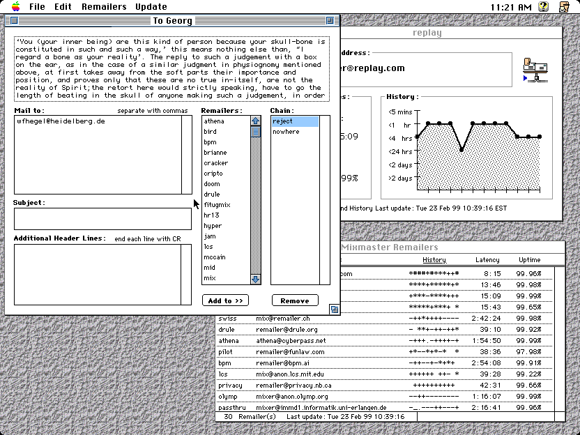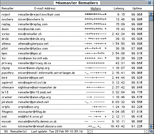 Even though Mixfit's future seems uncertain, this does not mean that MacOS users are left without a Mixmaster client -- at least for MacOS X'ers. With Apple's move to MacOS X, Apple has in fact moved to Unix. Theorectically, this means that Mac users will already have access to the newest Mixmaster release (2.9 beta). Users will probably have to compile it themselves and run it through the command line prompt of MacOS X. It's not going to pretty, but at last Mac users will not have to wait years before a lone programmer like myself finds the time to port it.