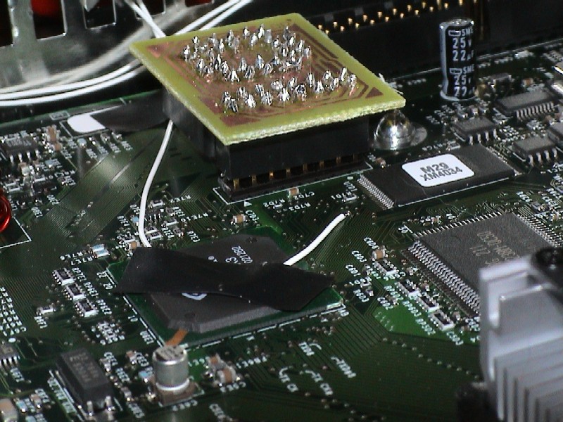 Now thanks to Max you can blow Cheapmods on your Matrix programmer. :-) Cadfael's PCB and switchCadfael (cad.fael@laposte.net) has sent the following nice pictures in from France, with a note:Andy, For the beginning I want to say that all the benefits must be sent to you for your wonderful tutorial on 'How build your homebrew LPC mod' and to Viperman from Xboxhacker for is modchip pcb. Many thanks to you. I was just concern on an easy way to plug and remove my modchip so I decided to use a pin header system to connect my modchip on the motherboard. This is just an extension to the tutorial mentioned before. It worked for me and I just want to bring my very very little stone to the scene. The only drawback is that you have to completely remove the motherboard to weld the pin header on the underside but it is a far better solution than wires (and also I think than the no solder pogo pins). It is stable, quick and easy to install, the mod can be removed with ease and replaced in seconds. No alignment, no setting up. The main benefit is that once your pin header is fitted you NEVER need to solder ANY mod into your XBOX ever again! Note also that the v1.1 consoles LPC holes are not filled in so it’s easier, just plug the header in and you're connected within minutes. For the patch wire, I chose to use the point 2 (GND) of the LPC connector cause like that I had only one 'difficult' point to weld on the motherboard instead of 2 (D0 and south side of C7C4) You can notice that I have also put a switch on the patch wire so I can easily turn on/off my modchip and boot on MS original bios or on my 'underground' one. Works fine too. I used the PCB of Viperman (works fine) with a pin header block and PLCC support for my chip. After programming my chip I only have to plug my chip on the motherboard. I sent you some photos, I suppose that it should be enough have a good idea of all the steps of my 'procedure'. Best regards from a french guy.  |