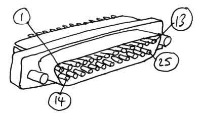 You need a 25-pin male D-connector, preferably with solder bucket termination (these are little cups that make it easy to solder wires to the connector). I only had a rightangle one lying around the office, of course that worked fine. You can find these lying around on scrap ISA printer port expansion cards. Here is a little reminder of which pins are which on a 25-pin male D-connector: