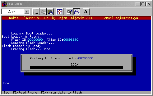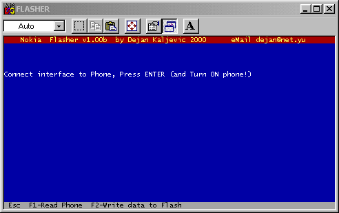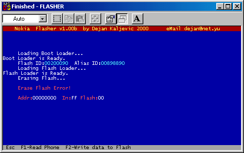 Sometimes it can happen that you get this what you can see on the left. When you get this, either you have not copied the correct f_loader.bin file into Nk_files folder or your connector is not properly attached to your phone. In this case check your connector because sometimes it can happen that one leg does not make a good connection on the phone. Connect the phone again to the flasher and if, after repeating all the steps, this happens again, copy a other f_loader.bin file in your Nk_files folder. In Nk_files folder you will find 8 folders with f_loader.bin files so you can experiment to find the right loader file for a specific phone. I work only with these 8 loader files and I have unlocked all phones that I had so don't give up. It will work. |