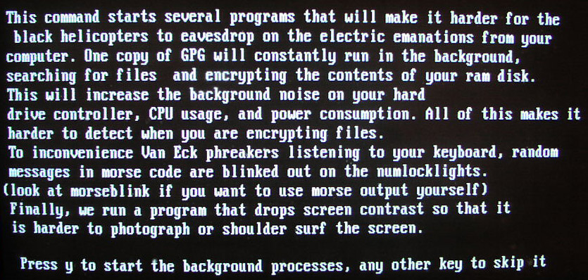 Anti Tempest feature: As seen from the readme.txt file attributed to this small Linux distribution - " TinFoil Hat Linux uses ctheme to manipulates the VGA console palette.