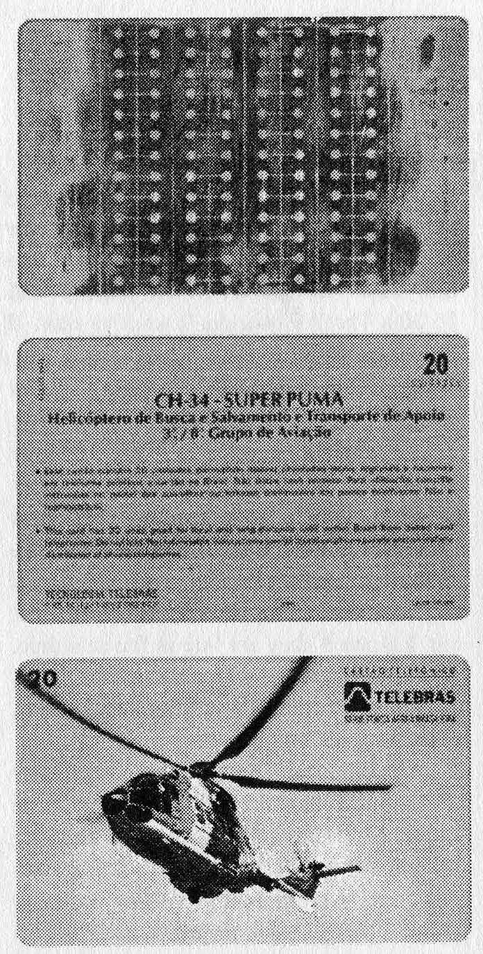 A new card (middle, bottom) worth 20 units (60 minutes).I've done some research on them. According to the publication Card Technology Today, the card is either inductive or magnetic. It's basically a plastic card with a thin metal plate, covered by a kind of gray ink or plastic, very hard to take out. If one bothers to take away this ink or plastic and get to see the metal, they will find that it is cut by holes and lines. This sequence is repeated four times, and it is the same in all cards, regardless of the number of units. Some people claim that by cutting on the corner of the card or on some special place, an infinite card can be created. Others claim that by soldering with care, it is also possible to achieve the same thing. The official explanation is that the cards have some microfuses that the phone "burns" as the time and the talk go by.