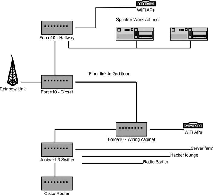 The HOPE network typically consists of about 1000 feet of fiber optic cable, 5000 feet of Cat 5, and two dozen wireless APs. The exactly layout varies year to year depending on what gear is contributed. For HOPE Number 9, the core network was assembled from HPE Aruba, Cisco, Juniper, and Force10 gear.