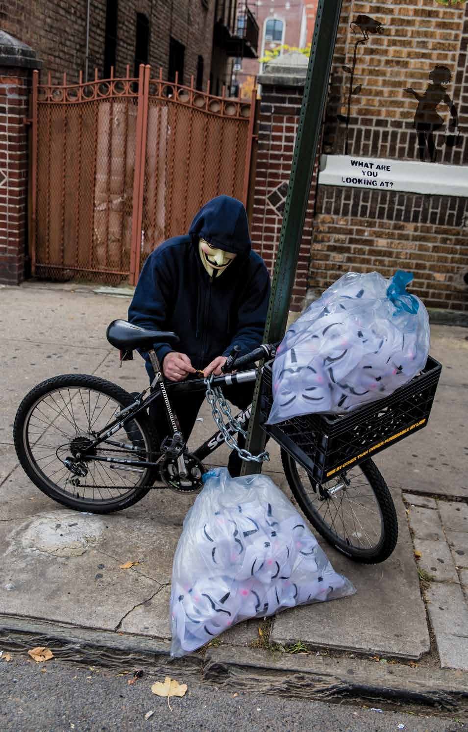 A hooded man in an Anonymous mask is seen unlocking his bicycle with two large bags of masks in tow.