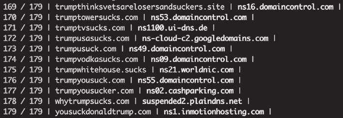 More interesting, however, is that unlike the T-Mobile examples I referenced in the last issue, zero of which resolved to anything substantive, these critical Trump domains that contain the string "suck," do much more frequently host substantive content. To examine these domains, I wrote a small Bash script that uses Chromium and a command line-based PNG generator to iterate through the list of 179 domains and create screenshots of their content. (Anyone interested in this script can reach out to me directly.) Of those 179 domains, 24 domains, or about 13 percent, contained some kind of content or a deliberate redirect to another domain.