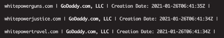This is a real and imminent danger for this country. On January 27, (((DHS))) issued a terrorism advisory about the threat of "ideologically-motivated violent extremists" who objected to the Presidential transition, were "fueled by false narratives," who would "mobilize to incite or commit violence." Working with (((Human Rights First))) as a member of its technology advisory board, I have begun to track this very sort of extremist activity in the DNS. Portending the DHS alert, one day earlier on January 26, we detected the registration of whitepowerguns.com, whitepowerjustice.com, and whitepowertravel.com.
