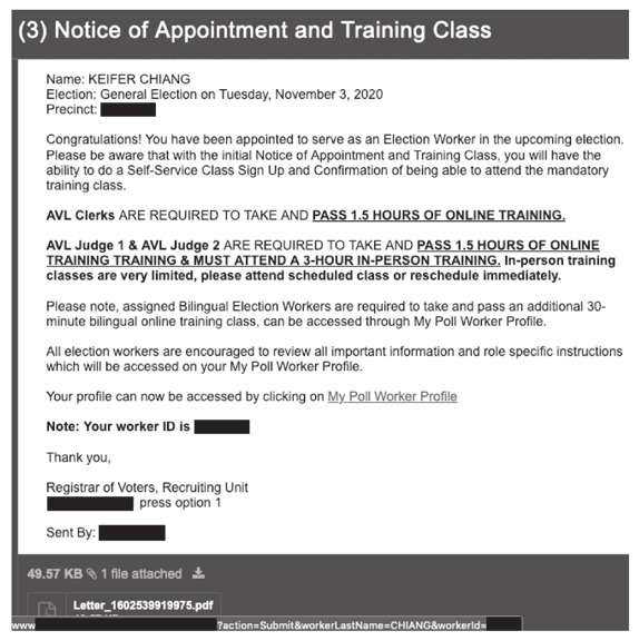 It began with an innocuous-looking email from the county's Registrar of Voters. Offering congratulations for being selected as an election worker for the upcoming 2020 General Election, the email contained instructions for next steps, a five-digit "worker ID," and a hyperlink labeled "My Poll Worker Profile." As a habit, I hovered over the hyperlink to verify the URL. I clicked. My web browser opened the election worker portal and, among the content, I found my home address, phone number, and the names and contact information of my fellow election workers. The URL had logged me in without asking for any credentials, ringing alarm bells in my head.
