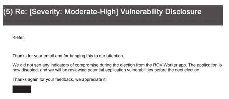 The next day, I received an email response from the analyst, informing me that the information security team did not find any indicators of compromise during the election from the portal, that they had disabled the application, and that they would be reviewing potential vulnerabilities before the next election.