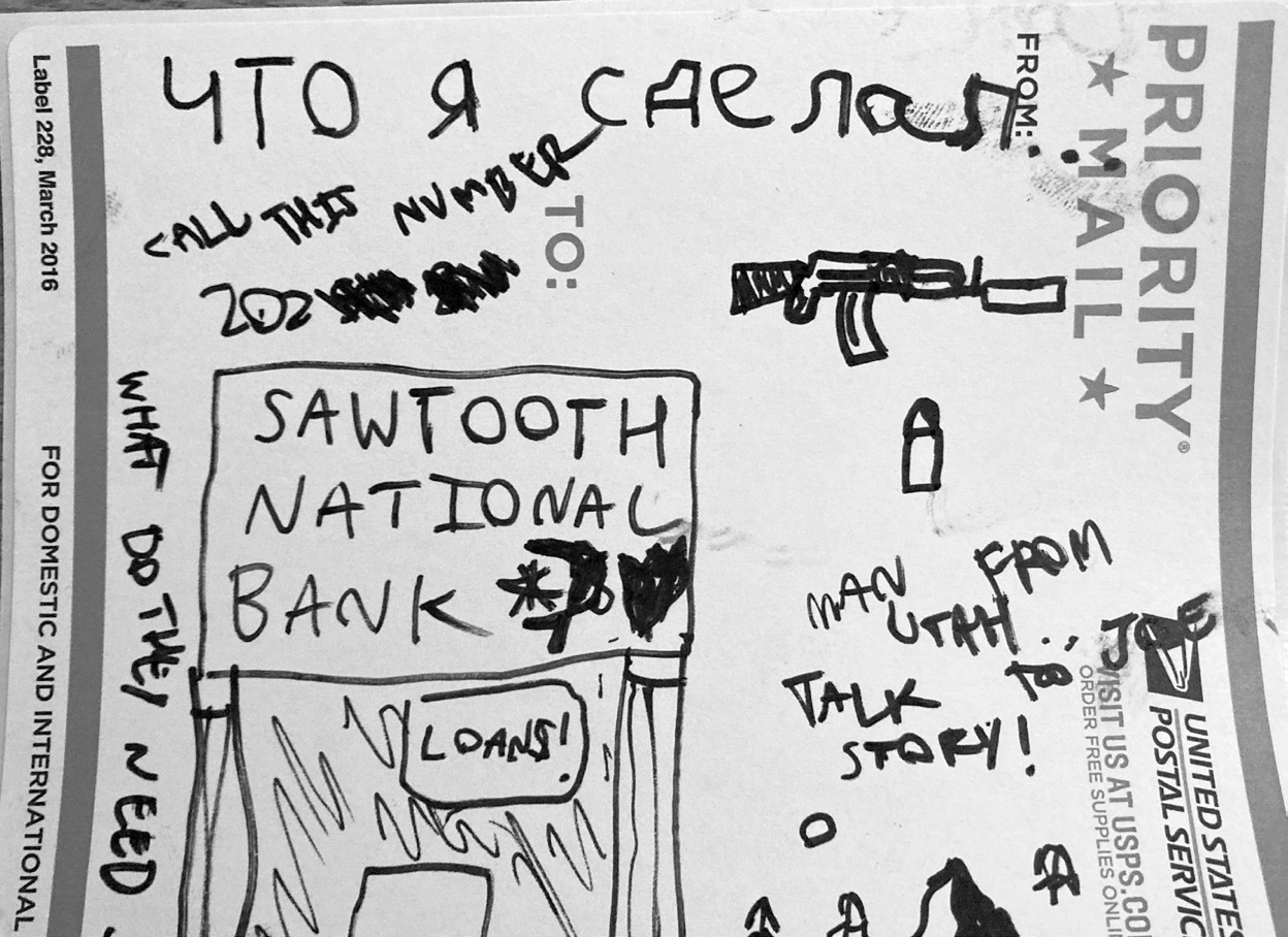 One drawing that kept appearing on my pages was a rough sketch of Sawtooth's front entrance. It had a big sign that said, "SAWTOOTH NATIONAL BANK" with a picture of a marlin on it. To me, Sawtooth felt like a supernatural being, something so powerful that I couldn't even see the true gravity of my actions. It was like I had messed with a higher power. My wax wings melted in the desert heat.