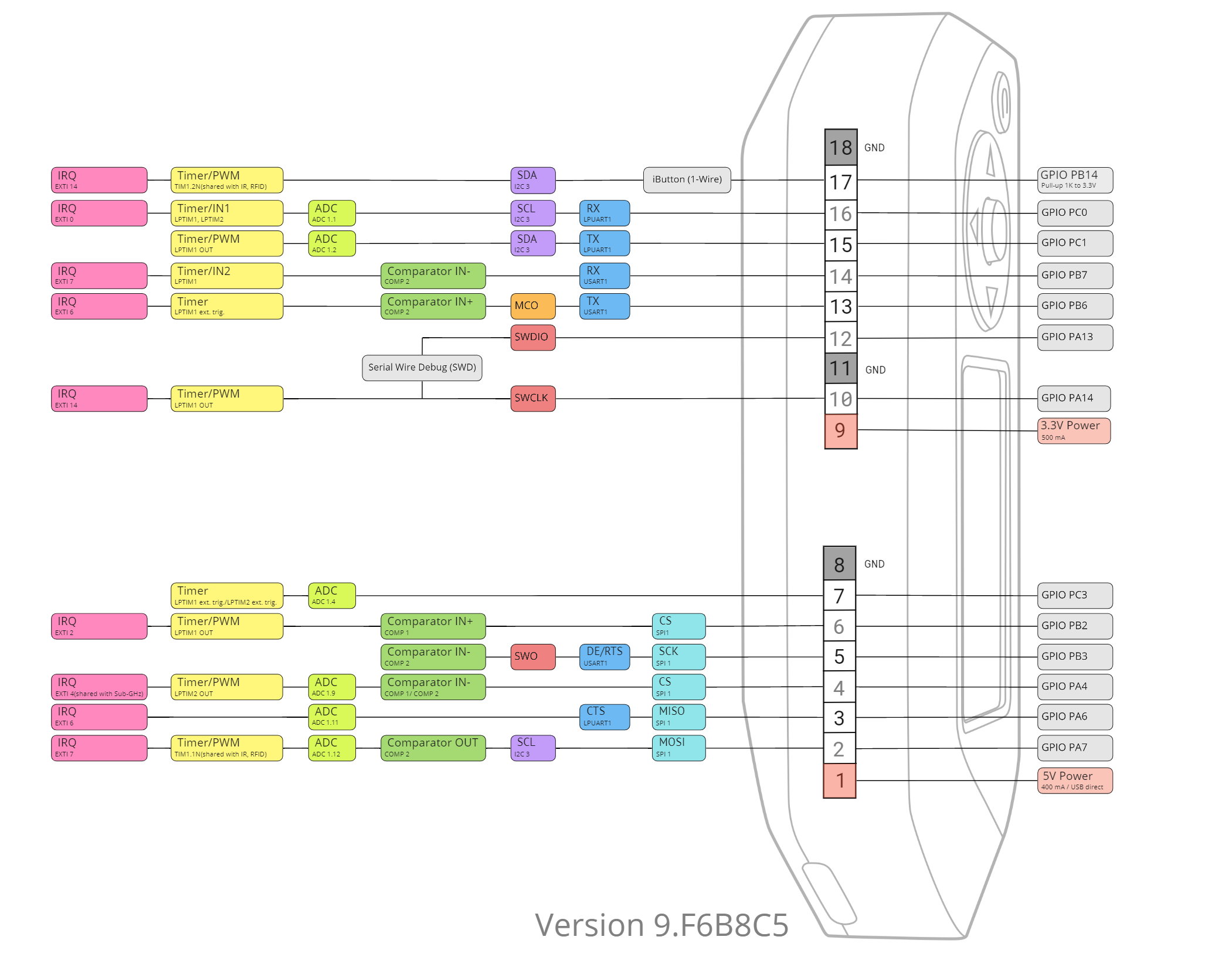 MCU (Microcontroller Unit) Model: STM32WB55RG ARM Cortex-M4 32-bit 64 MHz (application processor) ARM Cortex-M0+ 32 MHz (network processor) Flash: 1024 kB SRAM: 256 kB Display Resolution: 128 x 64 pixels (LCD monochrome) Controller: ST7565R Interface: SPI Diagonal Size: 1.4" Battery LiPo 2000 mAh Seven days approximate working life (I have tested this, it works as advertised.) Sub-1 GHz Module Chip: TI CC1101 TX Power: 0 dBm max Frequency Bands (depends on your region): 315 MHz, 433 MHz, 868 MHz, 915 MHz Note: Unlocked firmware exists, so if you flash the device you can RX/TX on all of these frequencies. If using official, you cannot transmit, and only receive on bands depending on region. Near-Field Communication (NFC) Frequency: 13.56 MHz Supported Cards: ISO-14443A/B NXP MIFARE Classic/Ultralight/DESFire/etc FeliCa NFC Forum Protocols RFID 125 kHz Frequency: 125 kHz Modulation: AM, PSK, FSK Supported Cards: EM-400x, EM-410x, EM-420x, HID Prox, Indala GPIO 3.3 CMOS level Input 5V Tolerant Up to 20 mA per digital pin Bluetooth LE 5.0 TX Power: 0 dBm max RX Sensitivity: -96 dBm Data Rate: 2 Mbps microSD Up to 64 GB microSDHC Read/Write speed: Up to 5 Mbit/s Buzzer Frequency: 100-2500 Hz Sound Output: 87 dB Type: Coin Vibration Motor Force value: 30 N Speed: 13,500 rpm Infrared TX/RX Range: 800-950 nm TX Power: 300 mW iButton 1-Wire Operate Modes: Reader/Writer/Emulator Supported Protocols: Dallas DS1990A, CYFRAL Control 5-button joystick Back button Reboot - Back + Left buttons for 2 seconds USB 1x USB 2.0 port, type C USB device Charging Physical Size: 100 x 40 x 25 mm Weight: 102 grams Body Materials: PC, ABS, PMMA Operating Temperature: 0 ~ 40 °CReferences