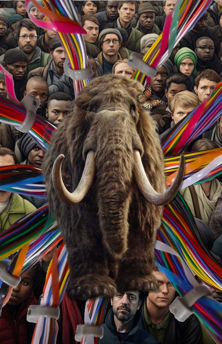 An allusion to chaos theory is made in the form of a butterfly perched atop the mastodon.
