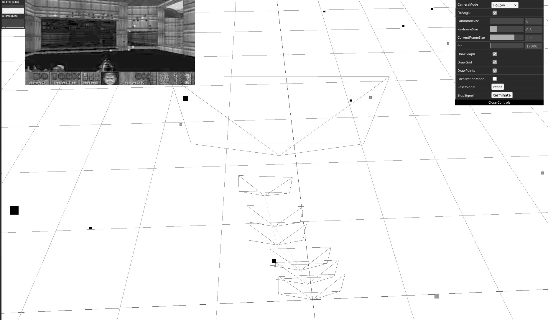 Camera: name: "RICOH THETA S 960" setup: "monocular" model: "equirectangular" fps: 30.0 cols: 320 rows: 200 color_order: "RGB" Preprocessing: min_size: 2 Feature: name: "default ORB feature extraction setting" scale_factor: 1.2 num_levels: 8 ini_fast_threshold: 20 min_fast_threshold: 7 Mapping: backend: "g2o" baseline_dist_thr_ratio: 0.02 redundant_obs_ratio_thr: 0.9 num_covisibilities_for_landmark_generation: 20 num_covisibilities_for_landmark_fusion: 20 erase_temporal_keyframes: false num_temporal_keyframes: 15 Tracking: backend: "g2o" enable_temporal_keyframe_only_tracking: false KeyframeInserter: wait_for_local_bundle_adjustment: false Relocalizer: search_neighbor: true LoopDetector: backend: "g2o" System: map_format: "msgpack" num_grid_cols: 47 num_grid_rows: 30The results of running the Doom bag file though the stella_vslam_ros package can be seen in the image below. Note that the large frustum shows the character's current position. The smaller frustums show where the character has been. The light (current frame) and dark (map) dots are visual key features that stella_vslam_ros uses in its frame to map approach to track camera position or, in this case, player movement.