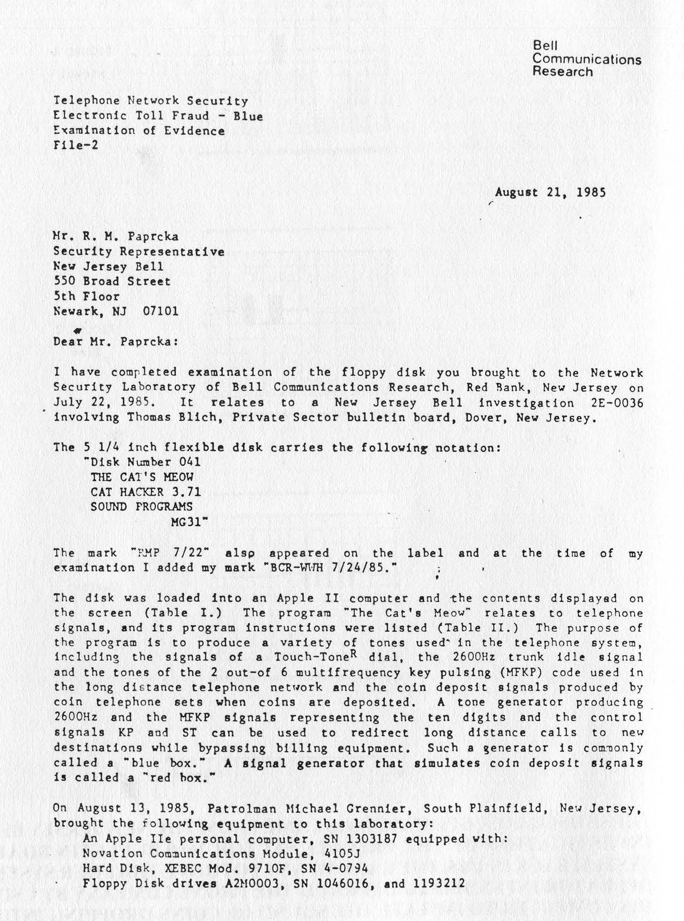 Those oscilloscope readings came from the New Jersey Bell investigation of the Private Sector 2600 bulletin board system back in 1985.