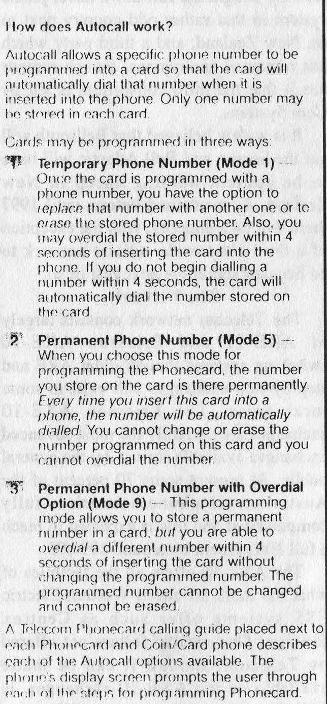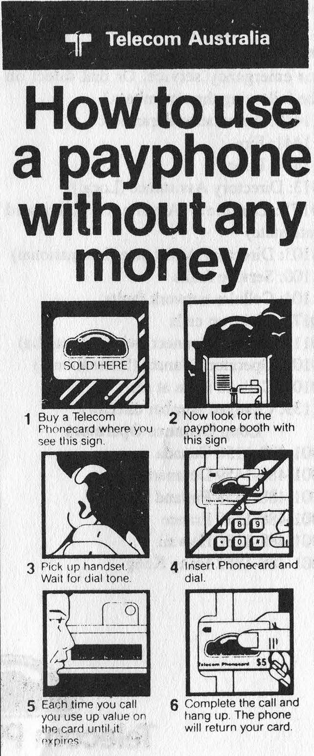 Phonecard Payphone: The new standard payphone in Australia is the new Telecom Phonecard Payphone. This phone uses either coins or pre-paid telephone cards similar to the cards that NTT (Japan) used to use in their payphones until the introduction of smartcard telephone cards. These payphones are usually located in places such as airports, hotels, and on the street.