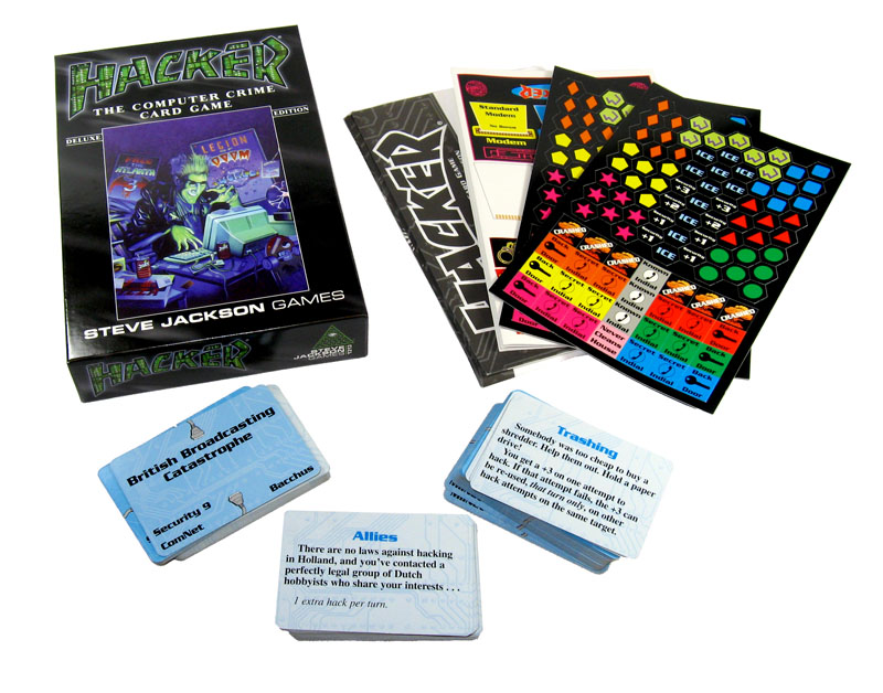 Hacker: The Computer Crime Card Game, is Steve Jackson's latest gaming foray into the hacking/phreaking world. As the introduction explains, the game was conceived after the Secret Service wrongfully raided his company in 1990. Jackson's response was a logical one: sue the Secret Service and make a game about it. Hacker, then, is Jackson's way of letting the Secret Service know how much he appreciated having his rights violated.