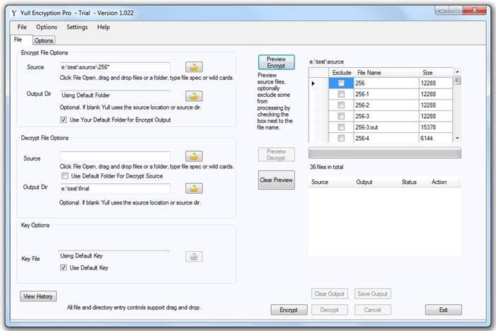 Now a word about the preview grid on the main tab. You can encrypt files from the GUI app in several ways. You can put one file name into the source. You can put wild cards into the source (like 256*.*). You can press "Preview Encrypt" and the Preview Grid will show all the files in the source folder (and you can do the same with decryption):