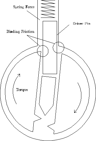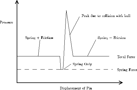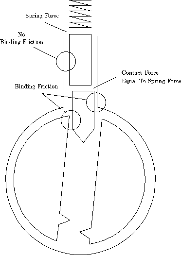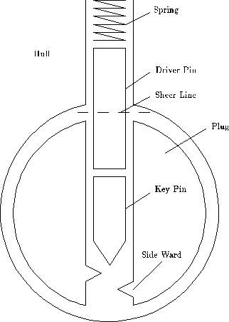 Chapter 5 The Pin Column Model The flatland model of locks can explain effects that involve more than one pin, but a different model is needed to explain the detailed behavior of a single pin. See Figure 5.1. The pin-column model highlights the relationship between the torque applied and the amount of force needed t lift each pin. IT is essential that you understand this relationship. In order to understand the "feel" of lock picking you need to know how the movement of a pin is effect by the torque applied by your torque wrench (tensioner) and the pressure applied by your pick. A good way to represent this understanding is a graph that shows the minimum pressure needed to move a pin as a function of how far the pin has been displaced from its initial position. The remainder of this chapter will derive that force graph from the pin-column model. Figure 5.2 shows a single pin position after torque has been applied to the plug. The forces acting of the driver pin are the friction from the sides, the spring contact force from above, and the contact force from the key pin below. The amount of pressure you apply to the pick determines the contact force from below. The spring force increases as the pins are pushed into the hull, but the increase is slight, so we will assume that the spring force is constant over the range of displacements we are interested in. The pins will not move unless you apply enough pressure to overcome the spring force. The binding friction is proportional to how hard the driver pin is being scissored between the plug and the hull, which in this case is proportional to the torque. The more torque you apply to the plug, the harder it will be to move the pins. To make a pin move, you need to apply a pressure that is greater than the sum of the spring and friction forces. When the bottom of the driver pin reaches the sheer line, the situation suddenly changes. See Figure 5.3. The friction binding force drops to zero and the plug rotates slightly (until some other pin binds). Now the only resistance to motion is the spring force. After the top of the key pin crosses the gap between the plug and the hull, a new contact force arises from the key pin striking the hull. This force can be quite large, and it causes a peak in the amount of pressure needed to move a pin. If the pins are pushed further into the hull, they key pin acquires a binding friction like the driver pin had in the initial situation. See Figure 5.4. Thus, the amount of pressure needed to move the pins before and after the sheer line is about the same. Increasing the torque increases the required pressure. At the sheer line, the pressure increases dramatically due to the key pin hitting the hill. This analysis is summarized graphically in figure 5.5.