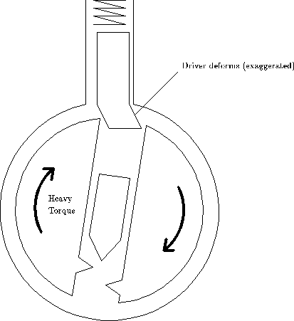 9.5 Elastic Deformation The interesting events of lock picking happen over distances measured in thousandths of an inch. Over such short distances, metals behave like springs. Very little force is necessary to deflect a piece metal over those distances, and when the force is removed, the metal will spring back to its original position. Deformation can be used to your advantage if you want to force several pins to bind at once. For example, picking a lock with pins that prefer to be set from front to back is slow because the pins set one at a time. This is particularly true if you only apply pressure as the pick is drawn out of the lock. Each pass of the pick will only set the front most pin that is binding. Numerous passes are required to set all the pins. IF the preference for setting is not very strong(i.e. the axis of the plug holes is only slightly skewed from the plug's center line), then you can cause additional pins to bind by applying extra torque. Basically, the torque puts a twist in the pug that causes the front of the plug to be deflected further than the back of the plug. With light torque, the back of the plug stays in its initial position, but with medium to heavy torque, the front pin columns bend enough to allow the back of the plug to rotate and thus cause the back pins to bind. With the extra torque, a single stroke of the pick can set several pins, and the lock can be opened quickly. Too much torque causes its own problems. When the torque is large, the front pins and plug holes can be deformed enough to prevent the pins from setting correctly. In particular, the first pin tends to false set low. Figure 9.2 shows how excess torque can deform the bottom of the driver pin and prevent the key pin from reaching the sheer line. This situation can be recognized by the lack of give in the first pin. Correctly set pins feel springy if they are pressed down slightly. A falsely set pin lacks this springiness. The solution is to press down hard on the first pin. You may want to reduce the torque slightly, but if you reduce torque too much then the other pins will unset as the first pin is being depressed. It is also possible to deform the top of the key pin. The key pin is scissored between the plug and the hull and stays fixed. When this happens, the pin is said to be false set high.