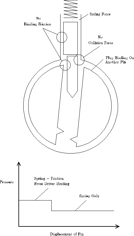 9.7 Pin Diameter When the pair of pins in a particular column have different diameters, that column will react strangely to the pressure of the pick. The top half of Figure 9.3 shows a pin column with a driver pin that has a larger diameter than the key pin. As the pins are lifted, the picking pressure is resisted by the binding friction and the spring force. Once the driver clears the sheer line, the plug rotates (until some other pin binds) and the only resistance to motion is the spring force. If the key pin is small enough and the plug did not rotate very far, the key pin can enter the hull without colliding with the edge of the hull. Some other pin is binding, so again the only resistance to motion is the spring force. This relationship is graphed in the bottom half of the Figure. Basically, the pins feel normal at first, but then the lock clicks and the pin becomes springy. The narrow key pin can be pushed all the way into the hull without loosing its springiness, but when the picking pressure is released, the key pin will fall back to its initial position while the large driver catches on the edge of the plug hole. The problem with a large driver pin is that the key pin tends to get in the hull when some other pin sets. Imagine that a neighboring pin sets and the plug rotates enough to bind the narrow key pin. If the pick was pressing down on the narrow key pin at the same time as it was pressing down on the pin that set, then the narrow key pin will be in the hull and it will get stuck there when the plug rotates. The behavior of a large key pin is left as an exercise for the reader.