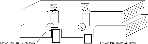 9.8 Beveled Holes and Rounded pins Some lock manufacturers (e.g., Yale) bevel the edges of the plug holes and/or round off the ends of the key pins. This tends to reduce the wear on the lock and it can both help and hinder lock picking. You can recognize a lock with these features by the large give in set pins. See figure 9.4. that is, the distance between the height at which the driver pin catches on the edge of the plug hole and the height at which the driver pin catches on the edge of the plug hole and the height at which the key pin hits the hull is larger (sometimes as large as a sixteenth of an inch) when the plug holes are beveled or the pins are rounded. While the key pin is moving between those two heights, the only resistance to motion will be the force of the spring. There won't be any binding friction. This corresponds to the dip in the force graph shown in Figure 5.5 A lock with beveled plug holes requires more scrubbing to open than a lock without beveled holes because the driver pins set on the bevel instead of setting on the top of the plug. The plug will not turn if one of the drivers is caught on a bevel. The key pin must be scrubbed again to push the driver pin up and off the bevel. The left driver pin in Figure 9.6a is set. The driver is resting on the bevel, and the bottom plate has moved enough to allow the right driver to bind. Figure 9.6 shows what happens after the right driver pin sets. The bottom plate slides further to the right and now the left driver pin is scissored between the bevel and the top plate. It is caught on the bevel. To open the lock, the left driver pin must be pushed up above the bevel. Once that driver is free, the bottom plate can slide and the right driver may bind on its bevel. If you encounter a lock with beveled plug holes, and all the pins appear to be set but the lock is not opening, you should reduce torque and continue scrubbing over the pins. The reduced torque will make it easier to push the drivers off the bevels. If pins unset when you reduce the torque, try increasing the torque and picking pressure. The problem with increasing the force is that you may jam some key pins into the hull.