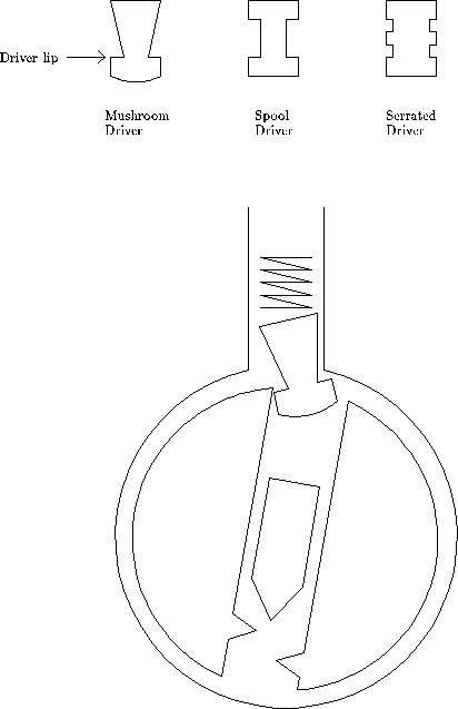 9.9 Mushroom Driver Pins A general trick that lock makers use to make picking harder is to modify the shape of the driver pin. the most popular shapes are mushroom, spool and serrated, see Figure 9.7. The purpose of these shapes is to cause the pins to false set low. These drivers stop a picking technique called vibration picking (see section 9.12), but they only slightly complicate scrubbing and one-pin-at-a-time picking (see chapter 4). If you pick a lock and the plug stops turning after a few degrees and none of the pins can be pushed up any further, then you known that the lock has modified drivers. Basically, the lip of the driver has caught at the sheer line. See the bottom of Figure 9.7. Mushroom and spool drivers are often found in Russwin locks, and locks that have several spacers for master keying. You can identify the positions with the mushroom drivers by applying a light torque and pushing up on each pin. The pins with mushroom drivers will exhibit a tendency to bring the plug back to the fully locked position. By pushing the key pin up you are pushing the flat top of the key pin against the tilted bottom of the mushroom driver. this causes the drive to straighten up which in turn causes the plug to unrotate. You can use this motion to identify the columns that have mushroom drivers. Push those pins up to sheer line; even if you lose some of the other pins in the process they will be easier to re-pick than the pins with mushroom drivers. Eventually all the pins will be correctly set at the sheer line. One way to identify all the positions with mushroom drivers is to use the flat of your pick to push all the pins up about halfway. This should put most of the drivers in their cockable position and you can feel for them. To pick a lock with modified drivers, use a lighter torque and heavier pressure. You want to error on the side of pushing the key pins too far into the hull. In fact, another way to pick these locks is to use the flat side of your pick to push the pins up all the way, and apply very heavy torque to hold them there. Use a scrubbing action to vibrate the key pins while you slowly reduce the torque. Reducing the torque reduces the binding friction on the pins. The vibration and spring force cause the key pins to slide down to the sheer line. The key to picking locks with modified drivers is recognizing incorrectly set pins. A mushroom driver set on its lip will not have the springy give of a correctly set driver. Practice recognizing the difference.