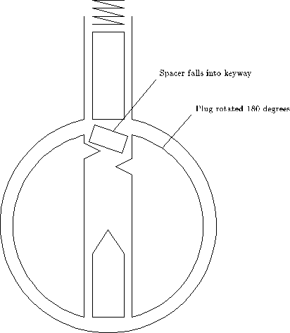 9.10 Master Keys Many applications require keys that open only a single lock and keys that opens group of locks. The keys that open a single lock are called _change keys_ and the keys that open multiple locks are called _master keys_. To allow both the change key and the master key to open the same lock, a locksmith adds an extra pin called a _spacer_ to some of the pin columns. See Figure 9.8. The effect of the spacer is to create two gaps in the pin column that could be lined up with the sheer line. Usually the change key aligns the top of the spacer with the sheer line, and the master key aligns the bottom of the spacer with the sheer line (the idea is to prevent people from filing down a change key to get a master key.) In either case the plug is free to rotate. In general, spacers make a lock easier to pick. They increase the number of opportunities to set each pin, and they make it more likely that the lock can by opened by setting all the pins at about the same height. In most cases only two or three positions will have spacers. You can recognize a position with a spacer by the two clicks you feel when the pin is pushed down. If the spacer has a smaller diameter than the driver and key pins, then you will feel a wise springy region because the spacer will not bind as it passes through the sheer line. It is more common for the spacer to be larger than the driver pin. You can recognize this by an increase in friction when the spacer passes through the sheer line. Since the spacer is larger than the driver pin, it will also catch better on the plug. If you push the spacer further into the hull, you will feel a strong click when the bottom of the spacer clears the sheer line. Thin spacers can cause serious problems. If you apply heavy torque and the plug has beveled holes, the spacer can twist and jam at the sheer line. It is also possible for the spacer to fall into the keyway if the plug is rotated 180 degrees. See section 9.11 for the solution to this problem.