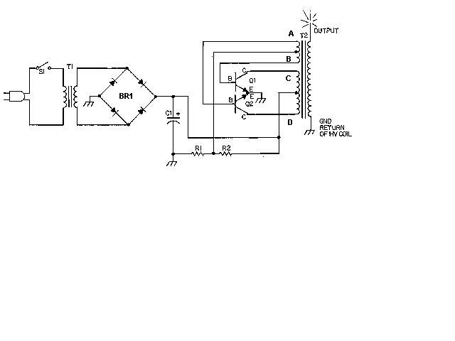 1. T2 is a high voltage flyback transformer salvaged from an old TV, or ordered from Fair Radio Sales. Look for the biggest, most intimidating transformer you can find. Old tube TV's are a good place to look. The transformer should not have a rectifier built in.