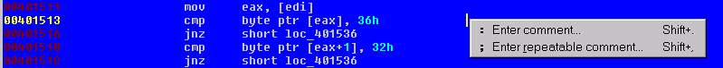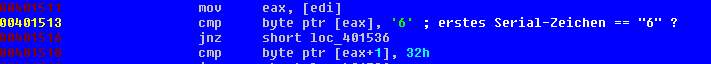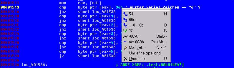 "36h" setzen und den ![]() Das Ergebnis dieser Aktion sieht so aus: ![]() Kommen wir nun zu einem weitern, sehr netten Feature von IDA: das Umbenennen von Referenzen. Wie wir sehen können, wird bei einem fehlgeschlagenen Vergleich zur Stelle "loc_401536" gesprungen, welche nachfolgend die Meldung anzeigt, daß eine Eingabe falsch war (die sogenannte "beggar-off"- oder auch "bad-cracker"-Meldung). Nun ist die Bezeichnung "loc_401536" nicht gerade sehr aussagekräftig. Viel schöner wäre es, wenn da etwas wie "bad_cracker" stehen würde. Klar könnte man einen Kommentar einfügen, aber der wäre ja nur lokal für diese Zeile sichtbar. Was wir bräuchten, wäre eine Möglichkeit, alle Referenzen von "loc_401536" umzubenennen. Hierzu machen wir einen Doppelklick auf "loc_401536" (egal auf welche Referenz), worauf wir uns hier wiederfinden sollten: ![]() Wir klicken nun mit der rechten Maustaste auf die Adresse "00401536" so daß folgendes Popup-Menü erscheint: ![]()