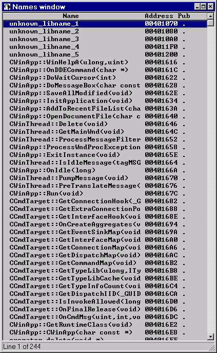 Aktuelle IDA-Versionen bieten ein schönes Feature namens "Automatic Parameter Recognition", was bewirkt, daß bei API-Funktionen die Parameter benannt werden (statt "push eax" steht als Kommentar eben noch dahinter, um welchen Parameter es sich handelt, z. B. "hWnd"). |