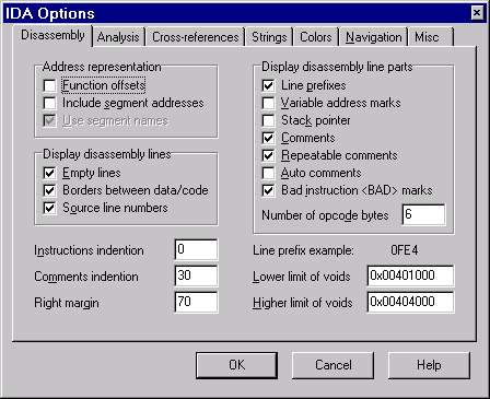 Wer z. B. gerne die Hexopcodes sehen möchte, trägt bei "Number of opcode bytes" die Anzahl der Bytes ein, die angezeigt werden sollen (6 ist hier ein guter Wert). Das ist vor allem zum Patchen sinnvoll, da man gleich die zu patchenden Bytes sehen kann. ![]() Wer gerne mehr als nur zwei Crossreferences angezeigt haben möchte, kann dies unter "Cross-references" beim Punkt "Number of displayed xrefs" einstellen.
