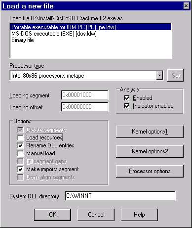 die Arbeitsweise mit IDA nachvollziehen kann. ![]() Wenn wir nun unseren Namen (ich nehme "medardus") und eine beliebige Serial (ich: "123456789") eingeben und auf den "CHECK"-Button klicken, erscheint folgende Meldung: ![]() Wir haben jetzt einen Ansatzpunkt, nämlich einen String, den wir im Sourcecode suchen können. Also starten wir IDA (ich beziehe mich auf die Vollversion 4.04, wobei natürlich alles bis aufs Speichern auch mit der Demo-Version funktioniert), indem wir "IDAG.EXE" aufrufen: ![]() Um ein Programm zu disassemblieren, ziehen wir es einfach in das IDA-Fenster oder öffnen es manuell über das File-Menü. In beiden Fällen erscheint folgendes Fenster: ![]()