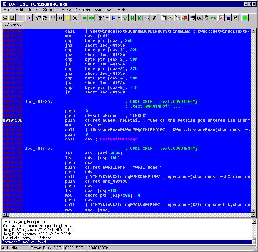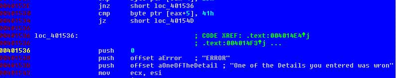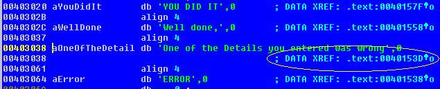 "Names". ![]() In diesem Fenster sind alle Referenzen - nicht nur auf Strings sondern auch auf Code usw. - enthalten. Strings wird defaultmäßig ein kleines "a" vorangestellt. Um unseren String "One of the Details you entered was wrong" zu suchen, wechseln wir in das Names-Fenster und tippen "aO" ein (da IDA hier nicht case-sensitive ist, würde auch "ao" funktionieren). Wir sollten nun folgendes sehen: ![]() Aha! Wir sehen den Text "aOneOfTheDetail". Das ist unsere String Referenz! Und was für ein Zufall: direkt darüber finden sich gleich noch zwei interessante Strings: "aYouDidIt" und "aWellDone". Wir wollen nun sehen, wo diese String Referenz benutzt wird, also machen wir einen Doppelklick auf unseren "aOneOfTheDetail"-String. ![]() Doch das ist nicht das, was wir erwartet haben. Wir befinden uns nun korrekterweise dort, wo der String definiert und deklariert wird. IDA macht es uns aber leicht, indem es uns - ganz in W32DASM-Manier - die Stelle(n) anzeigt, wo die Variable "aOneOfTheDetail" (deren Inhalt der String "One of the Details you entered was wrong" ist) verwendet wird (eine sogenannte Crossreferenz, abgekürzt "XREF"): ![]() Wie wir sehen können, wird die Variable nur an einer einzigen Stelle verwendet: in der Section ".text" an Adresse 0040153D, welche sich oberhalb der aktuellen Position befindet, was der Pfeil nach oben andeutet. Das kleine "o" gibt die Verwendung an. Hierbei steht "o" für "offset", "j" für "jump" und "p" für "procedure". Wir möchten nun sehen, wo die Variable verwendet wird, deshalb machen wir einen Doppelklick auf die XREF ".text:0040153D": ![]()