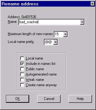 gehen und "n" drücken oder den ![]() Wir geben einen sinnvollen Namen wie z. B. "bad_cracker" ein und drücken auf "OK" Sofort sehen wir, daß alle Referenzen auf "loc_401536" in unseren neuen Namen geändert wurden: ![]() Zur Übung sollte das Gleiche mit entsprechend anderem Namen (z. B. "good_cracker") mit der Referenz "loc_40154D" gemacht werden.