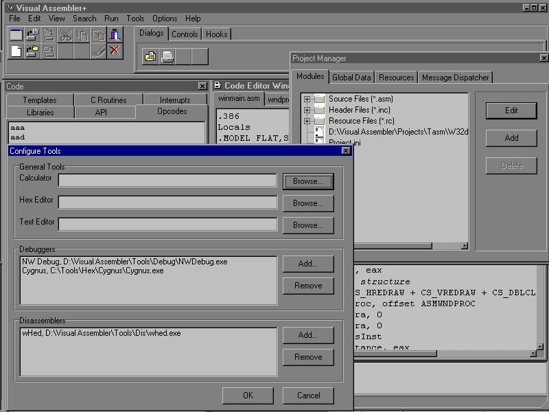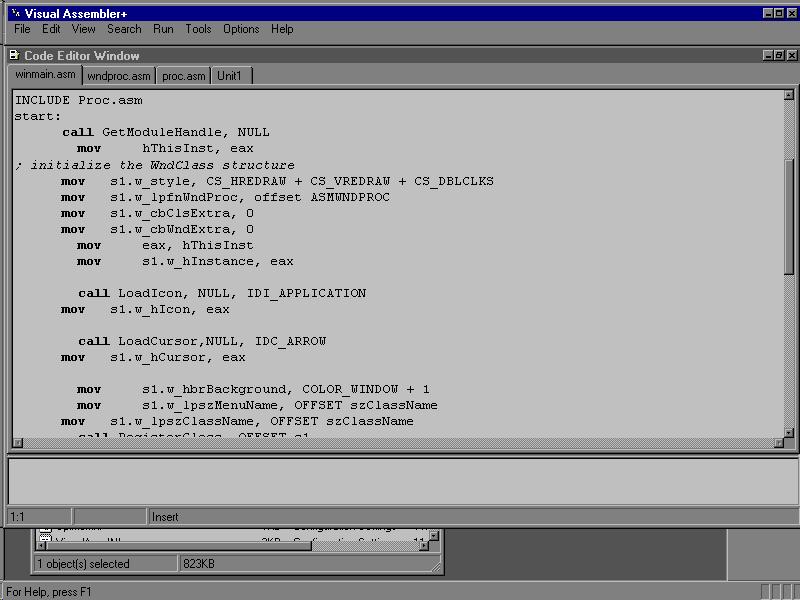 Visual Assembler as it first opens: toolbar, insertable code
