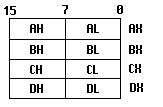 These are 16-bit registers. There are four general purpose registers; AX, BX, CX and DX. They are split up into 8-bit registers. AX is split up into AH which contains the high byte and AL which contains the low byte. On 386's and above there are also 32-bit registers, these have the same names as the 16-bit registers but with an 'E' in front i.e. EAX. You can use AL, AH, AX and EAX separately and treat them as separate registers for some tasks.
