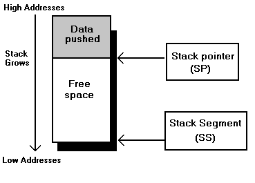 If another piece of data is put on the stack it grows downwards. As you can see the stack starts at a high address and grows downwards. You have to make sure that you don't put too much data in the stack or it will overflow.