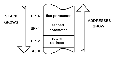 To get a parameter from the stack all you need to do is work out where it is. The last parameter is at BP+2 and then the next and BP+4.