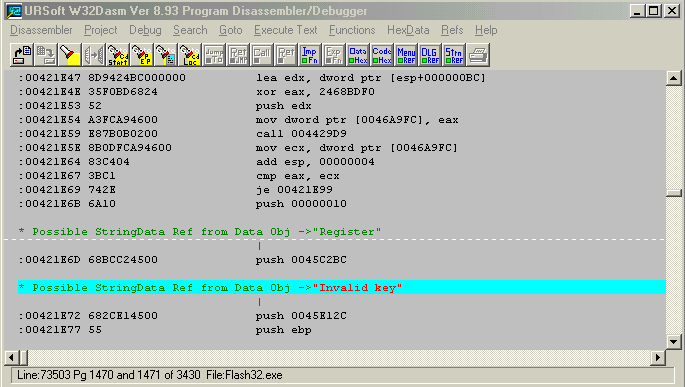 message box. Write this down. Fire up W32Dasm and disassemble Flash32. I’m