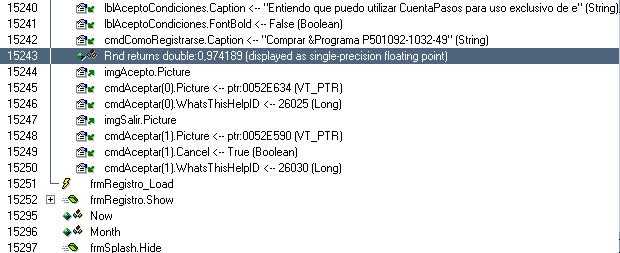 Obviously, the Rnd() function is the rtcRandomNext symbol. Now check the number of Rnd() callings before our target one using the SmartCheck list. Ok, we're interested on the second one. Load SoftIce and put a bpx rtcRandomNext. Now, run Cuentapasos from Windows and... BOOM. we're in the first Rnd() call. We're interested on the second one so push CTRL+D. Push F11 and we're just after the Rnd() call, at 0F0FE7C0h location of MSVBVM50.DLL. The random number is a floating point one so it's loaded on the floating point registers. To see these registers type wf on SoftIce. The random number is in the ST0 register. Run step by step with F8 and you'll find these codes:
