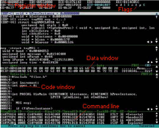 The screen on the picture is *slightly* different from the one you will get, coz you wont have the window-section between the Registers and the Data Window. This is due to the fact that you wont have any source code for the programs that you reverse engineer (it wouldnt be very wise to ask "why?" at this point...), so forget about it, okay ? Now to the marked windows... Everyone with a slice of ASM-knowledge knows what the registers are, so the register window is where the current values of them are shown. You can toggle this window on/off with the "wr" command. At the right hand of the Register window are shown the current states of the flags (the Zero-Flag is the most important one for our tasks, coz the execution of the conditional jumps jz, jnz etc. depend on it), if a flag is set its corresponding letter (eg. Z for the Zero-Flag) is highlighted. The data window displays data in memory, it is toggled with the "wd" command (if you want to display more lines for the data window you can set it to the desired state with "wd (number-of-lines)", use the same syntax for the other window commands... when adjusting one window you might have to adjust the other windows after that as well, so start setting the line-numbers for the top window and then go down respectively - otherwise you might mess up the other windows if you start configuring e.g. the code window first ;-)). You can display a specific memory location with the "d (location)" command, where location is the address in memory you want to examine. Underneath is the Code window, where the currently executing code part (in ASM of courze ;-)) is displayed. The highlited line shows the command which will be executed next. You can toggle this window with the "wc" command, "code on/off" changes the display of the opcode for the asm-commands. I guess that there is no need to explain the Command line, you simply type your softice commands here.