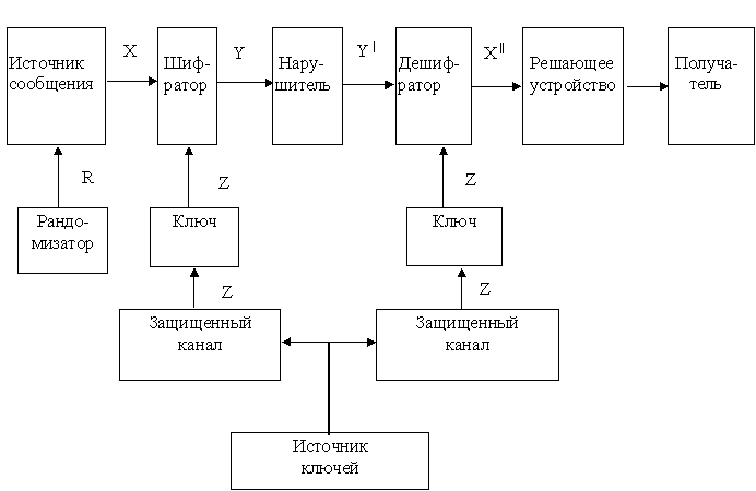 Источник сообщений вырабатывает произвольную информацию (открытые тексты) с каким-то распределением вероятностей. Шифратор шифрует это сообщение на конфиденциальном (известном только отправителю и получателю) ключе Z и переводит открытый текст в шифрованный текст или шифрограмму (криптограмму, шифртекст). Ключи вырабатываются источником ключей и по безопасным каналам рассылаются абонентом сети связи. Дешифратор раскрывает принятую шифрограмму и передает получателю.