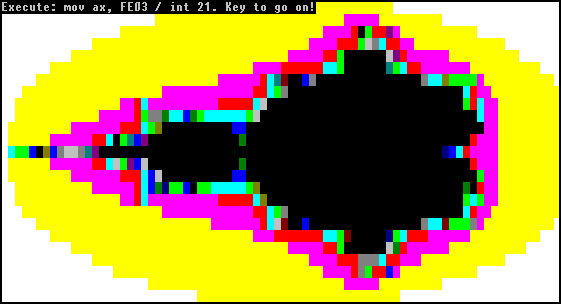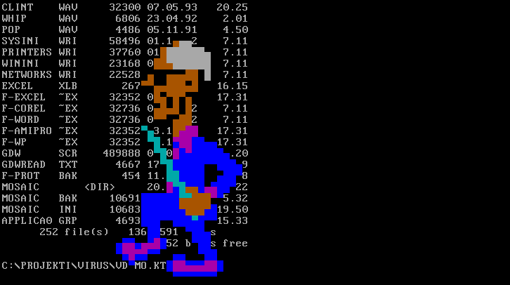 Graphical activation routines are somewhat rarer, but such are found in viruses like Den_Zuk, which produces a logo on-screen, or the HH&H virus, which shows a quite interesting 3D animation of a bouncing ball build out of small dots.